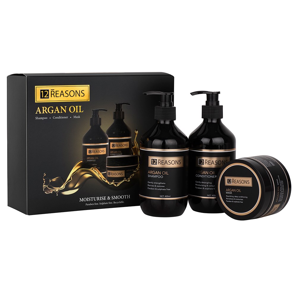 To Use: Apply 12Reasons Argan Oil Shampoo liberally to wet hair. Lather. Rinse. Follow with 12Reasons Argan Oil Hair Treatment Mask by applying liberally from mid-shaft to ends. Let process for 7-10 minutes. Rinse. Finish with 12Reasons Argan Oil Conditioner by applying to mid-lengths and ends. Condition. Rinse.