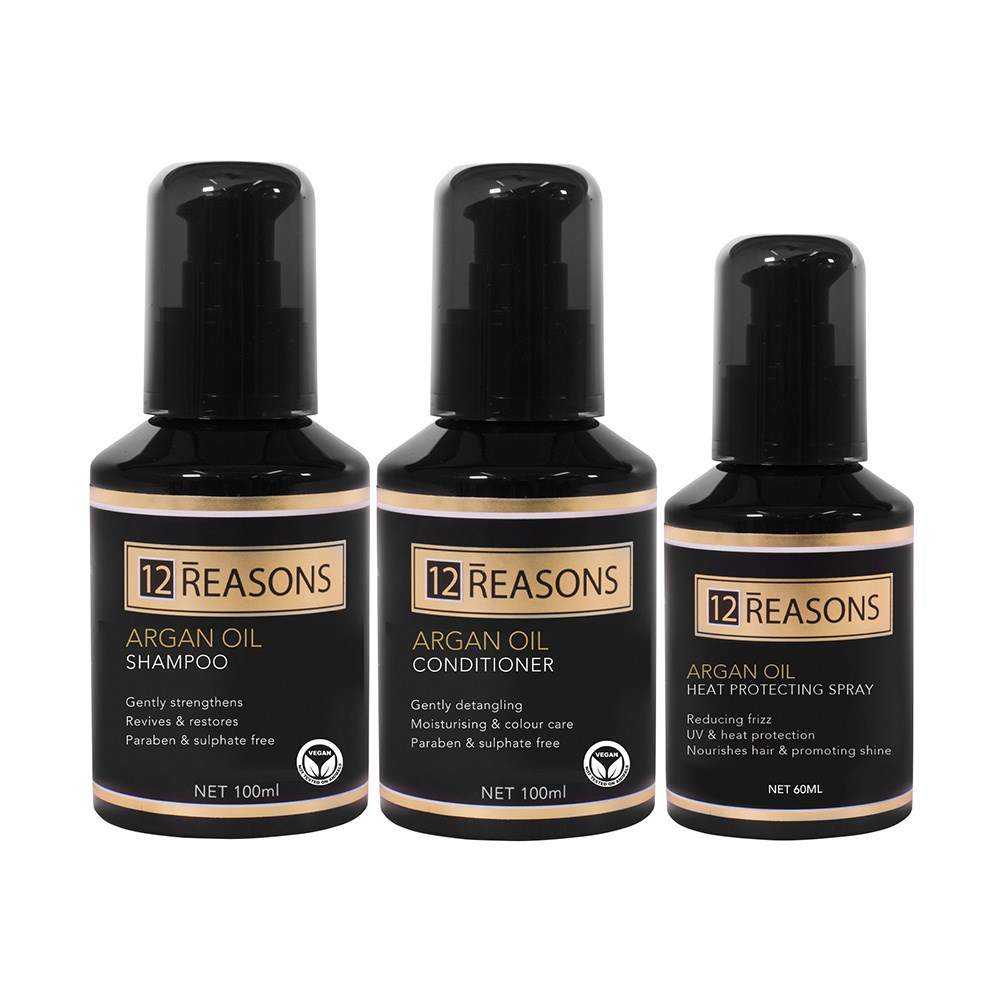 Love travel with 12Reasons! 12Reasons Argan Oil Travel Pack makes travel gorgeous with three mini, travel-sized products. Refresh radiance and restore vitality while moisturising. Frizz is tamed. Dry, limp hair is transformed, beaming with hydration. Enriched with argan, coconut and avocado oils for the best of nature. Free from parabens and sulphates. Colour-safe. Designed and formulated in Australia.