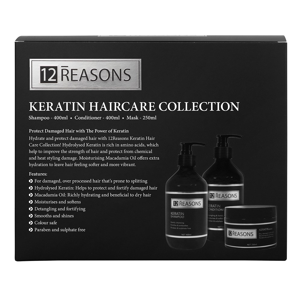 Hydrate and protect damaged hair with 12Reasons Keratin Moisturise Sale Pack ! Hydrolysed Keratin is rich in amino acids, which help to improve the strength of hair and protect from chemical and heat styling damage. Moisturising Macadamia Oil offers extra hydration to leave hair feeling softer and more vibrant. Vegan and not tested on animals. Sulphate and paraben free, colour safe and ideal for all hair types.