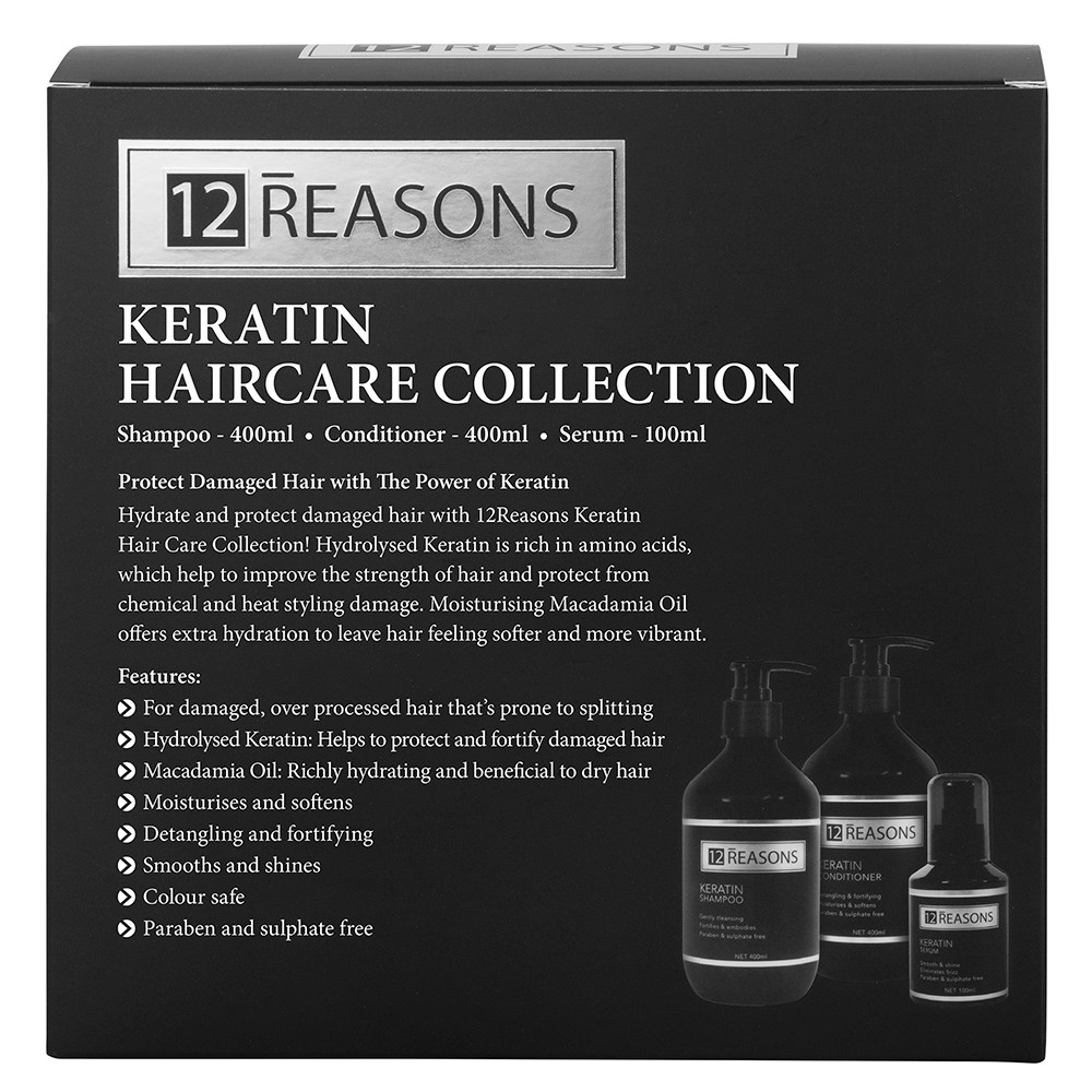 Hydrate and protect damaged hair with 12Reasons Keratin Shine Sale Pack ! Hydrolysed Keratin is rich in amino acids, which help to improve the strength of hair and protect from chemical and heat styling damage. Moisturising Macadamia Oil offers extra hydration to leave hair feeling softer and more vibrant. Vegan and not tested on animals. Sulphate and paraben free, colour safe and ideal for all hair types.