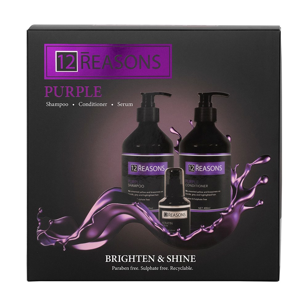 This is the perfect solution for dull blonde, grey and highlighted hair. Eliminate unwanted yellow and brassy tones with 12Reasons Purple Shampoo and Conditioner, while boosting essential hydration and nourishment. This Sale Pack comes with 12Reasons Keratin Hair Serum to infuse brilliant shine and prevent frizz. This brighten and shine set contains full-size products at a great price, making it a wonderful gift for yourself or a loved one. Vegan, cruelty-free, sulphate-free and paraben-free.
