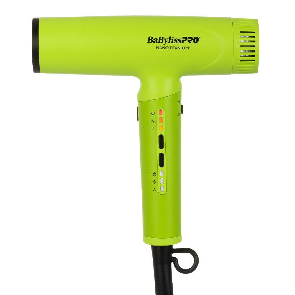 BaBylissPRO Nano Titanium Light Iconic Hair Dryer Green is amazingly compact, super-lightweight and high speed. Engineered airflow for faster drying. Ideally balanced T-shaped design weighs less than 453g and is almost the size of a smartphone! 1,400 watts of power and 9 digital heat/speed settings for versatile styling. Nano Titanium and ionic technologies ensure maximum smoothness and shine. Dual voltage enables worldwide usage – take this hair dryer anywhere! Three innovative attachments satisfy every styling demand: cool-to-touch concentrator nozzle with air gaps for faster cooling, contoured diffuser and straightening comb with curved teeth for superior tension during styling.