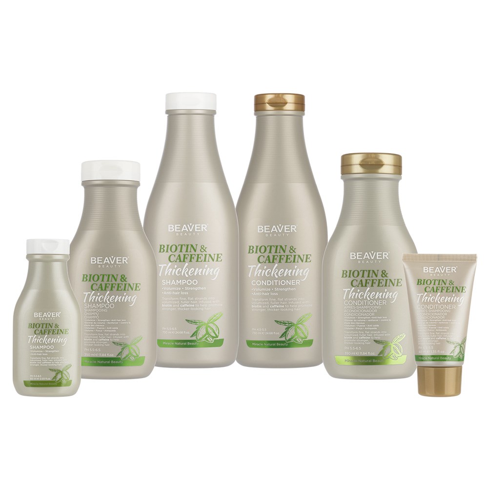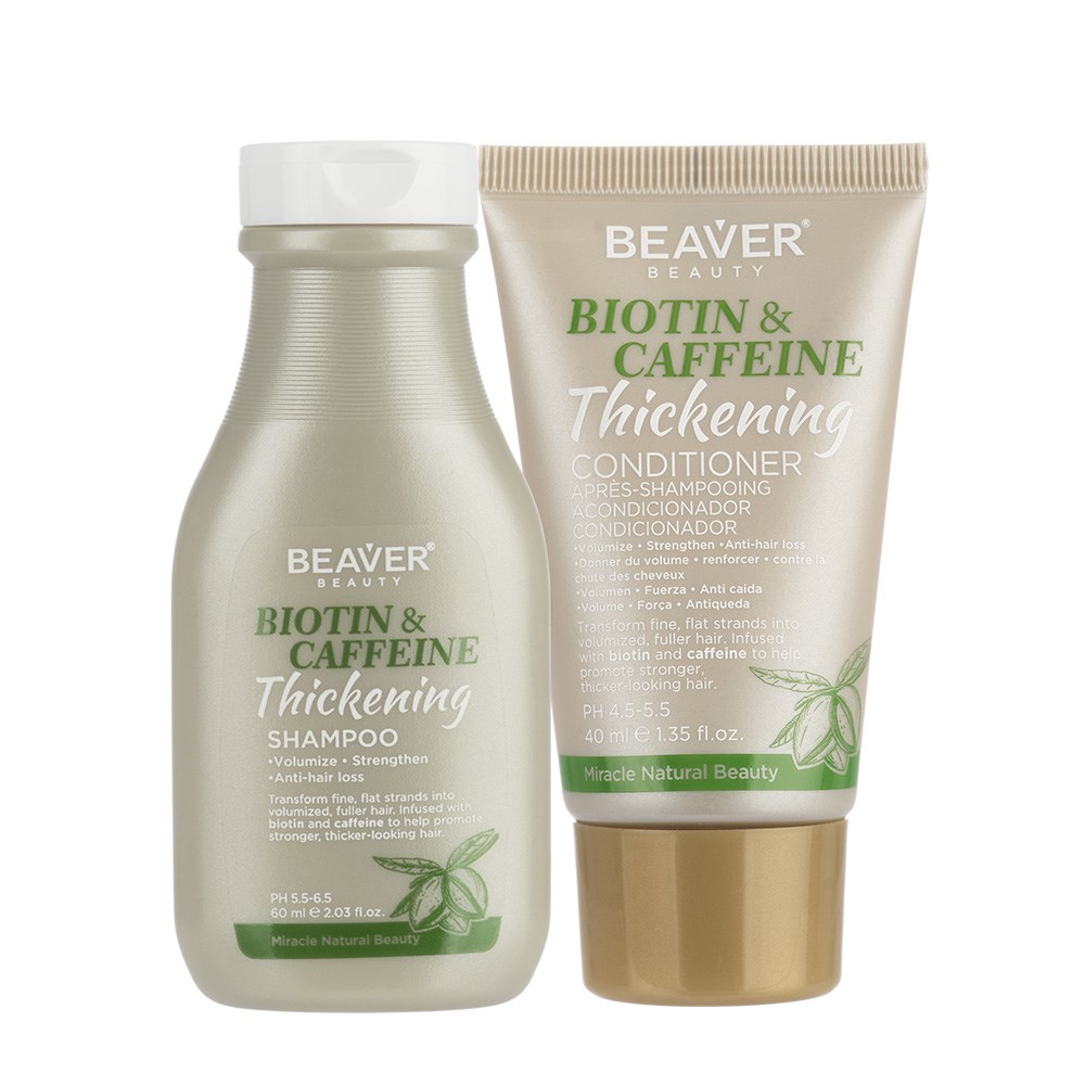 To Use: Wet hair, apply Beaver Biotin and Caffeine Thickening Shampoo and gently massage into hair and scalp. Rinse thoroughly and follow with the Beaver Biotin And Caffeine Thickening Conditioner.