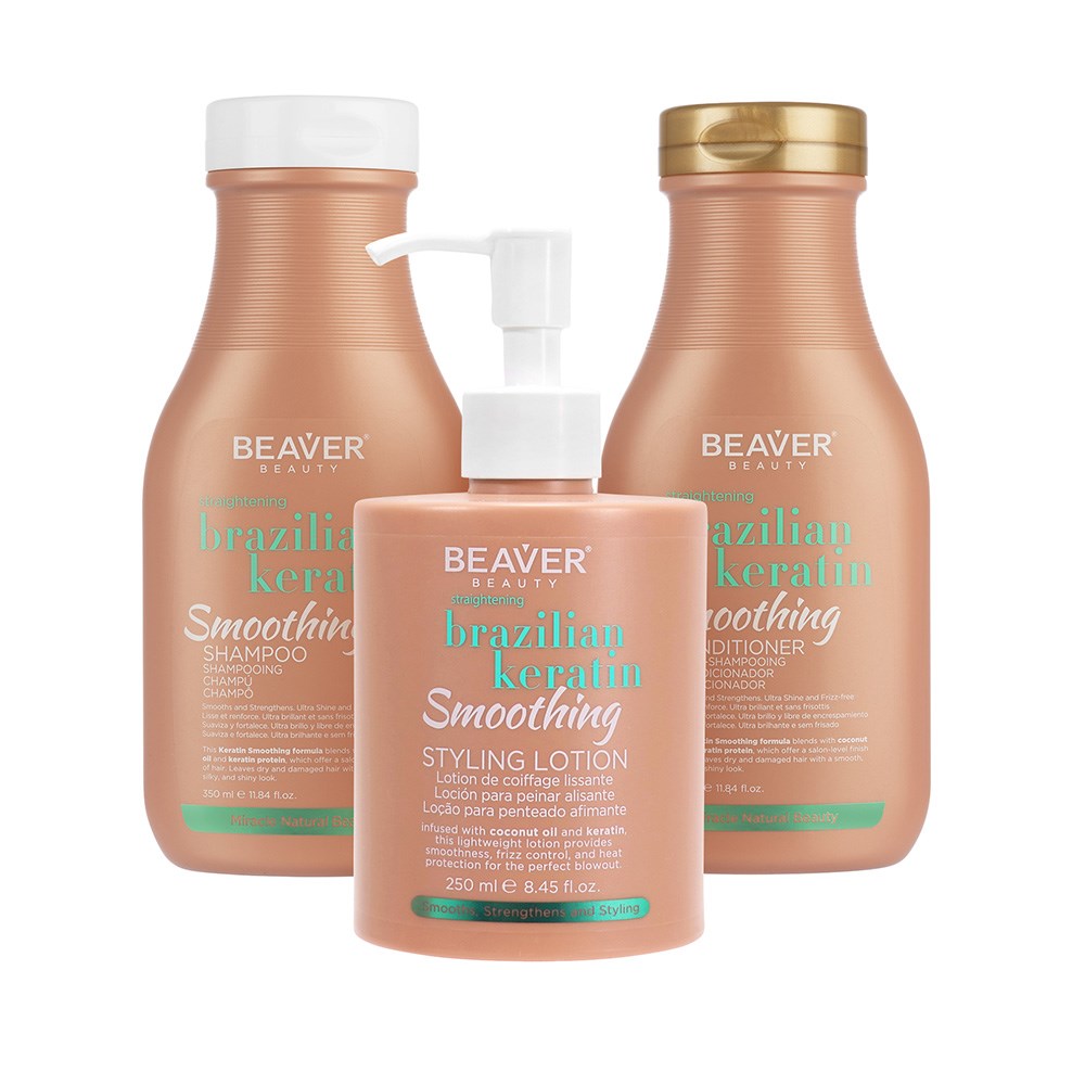 To Use: Apply Beaver Brazilian Keratin Smoothing Shampoo to wet hair, gently massage and rinse. Follow with Beaver Brazilian Keratin Smoothing Conditioner, massage into hair from root to ends. Rinse. Apply Beaver Brazilian Keratin Smoothing Styling Lotion to clean, towel-dried hair and distribute evenly with a brush, comb, or fingertips. Style as desired.