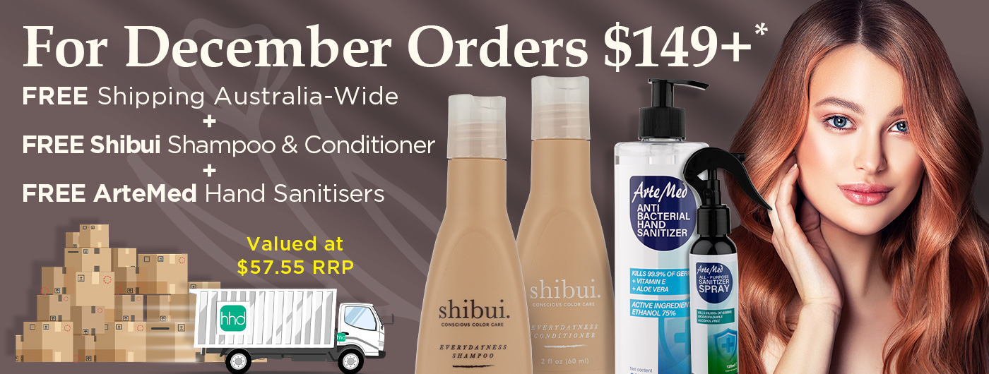 *Free shipping, 1 x Shibui Everydayness Shampoo 60mL, 1 x Shibui Everydayness Conditioner 60mL 1 x ArteMed Hand Sanitiser 500mL & 1 x ArteMed Sanitiser Spray 120mL on orders $149+. Valued at $57.55 RRP. No code needed. Items automatically added to eligible orders. Valid December 2025 or whilst stocks last. No rainchecks. Home Hairdresser reserves the right to change or rescind this offer at any time.