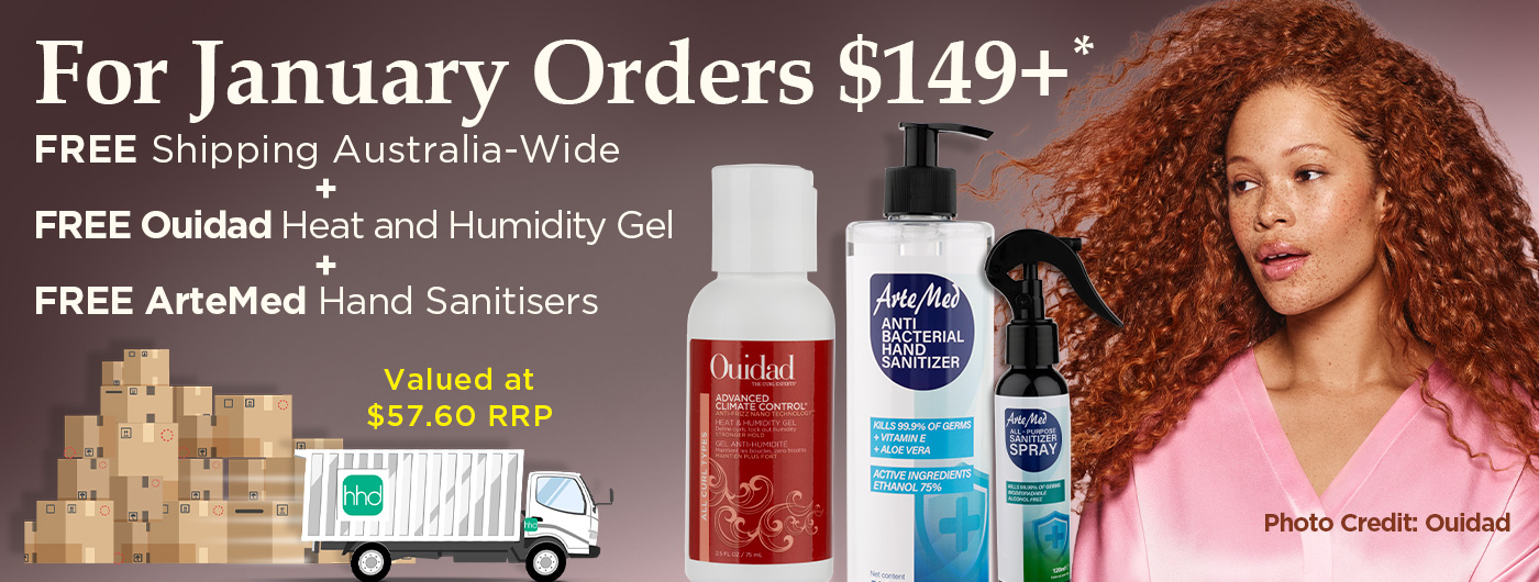 *Free shipping, 1 x Ouidad Advanced Climate Control Heat and Humidity Gel Stronger Hold 75mL, 1 x ArteMed Hand Sanitiser 500mL & 1 x ArteMed Sanitiser Spray 120mL on orders $149+. Valued at $57.60 RRP. No code needed. Items automatically added to eligible orders. Valid January 2026 or whilst stocks last. No rainchecks. Home Hairdresser reserves the right to change or rescind this offer at any time.