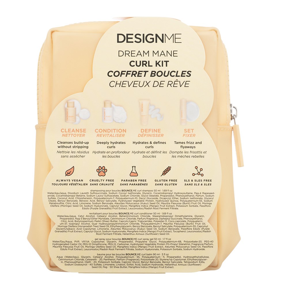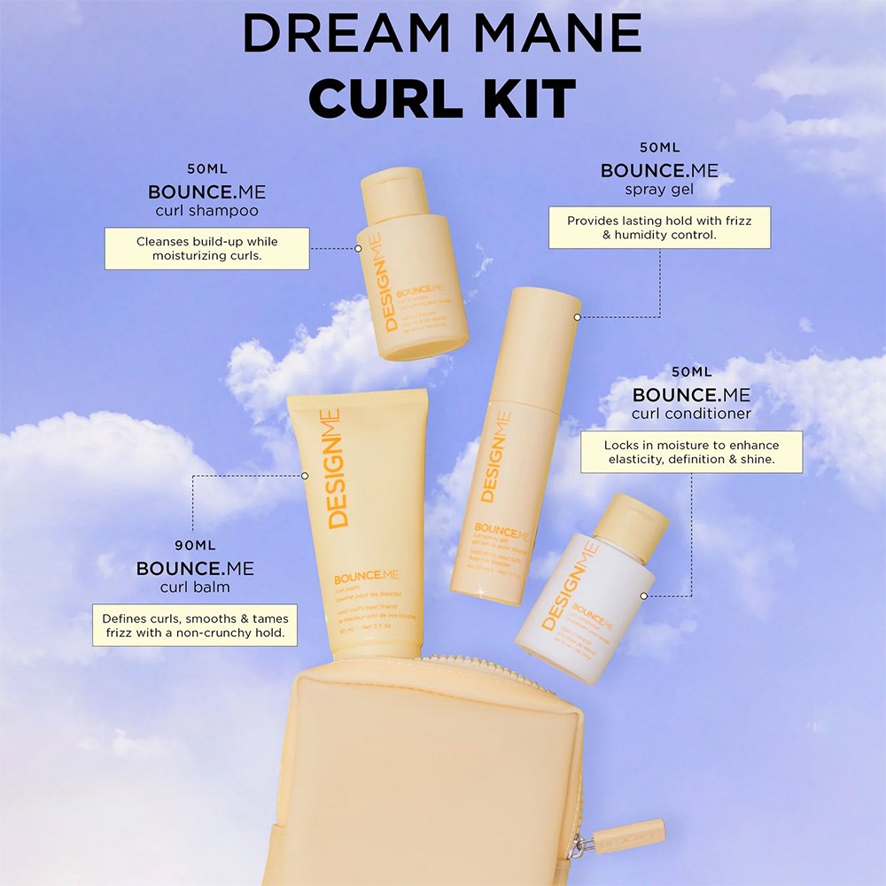 The ultimate four step routine for achieving bouncy, defined and frizz-free curls. DESIGNME Dream Mane Curl Kit is a dreamy, limited edition set with four minis from the Bounce.ME collection. Designed to hydrate, shape and smooth your strands while texture gets the care it deserves. With Bounce.ME Shampoo, Bounce.ME Conditioner, bestselling Bounce.ME Curl Balm and Bounce.ME Curl Spray Gel, this kit is a treat for curls! Vegan, cruelty-free, gluten-free, paraben-free and SLS/SLES-free.