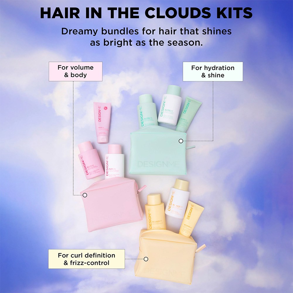 Float through your wash and style routine with limited edition DESIGNME Hair in the Clouds Kits. Perfect for gifting, these kits are available in Volume, Curl and Hydration. Each kit is packed up in a cute, pastel-coloured and reusable pouch.