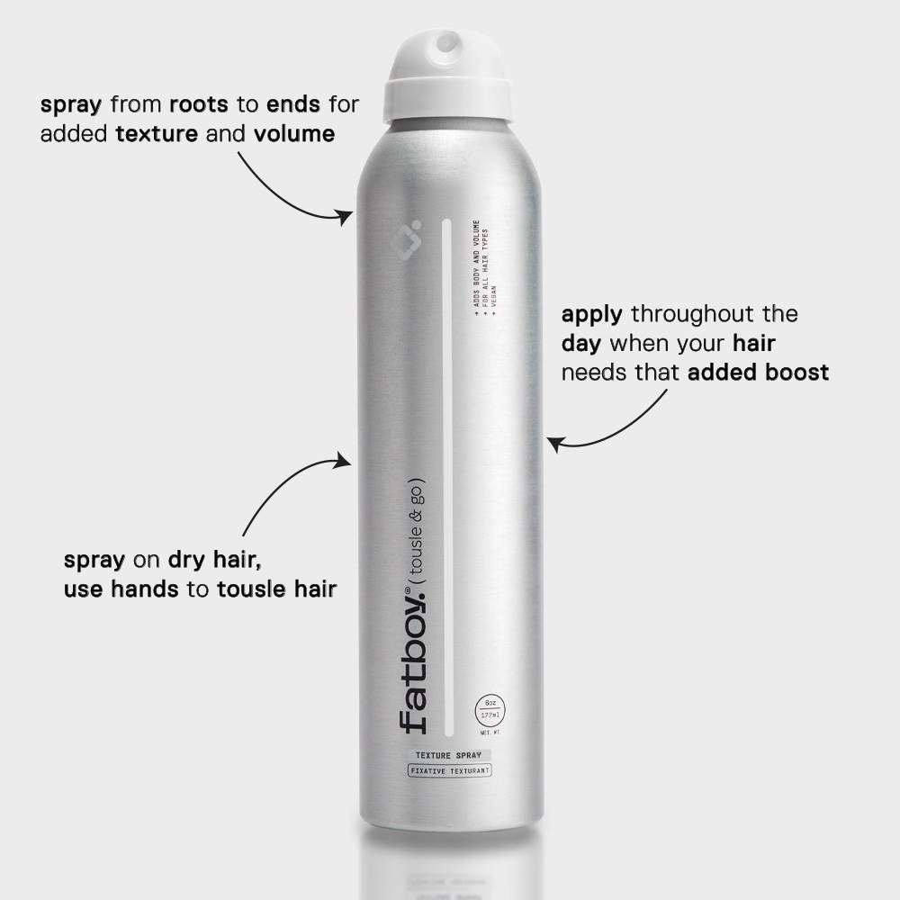 Fatboy Volumising Shampoo is powered by sunflower seed extract and bataua oil to hydrate and boost hair fullness. Hair shines after every use. Fatboy Volumising Conditioner harnesses sweet almond oil and wheat protein to strengthen, prevent breakage and enhance shine. Fatboy Tousle & Go Texture Spray adds volume, definition and workable hold.