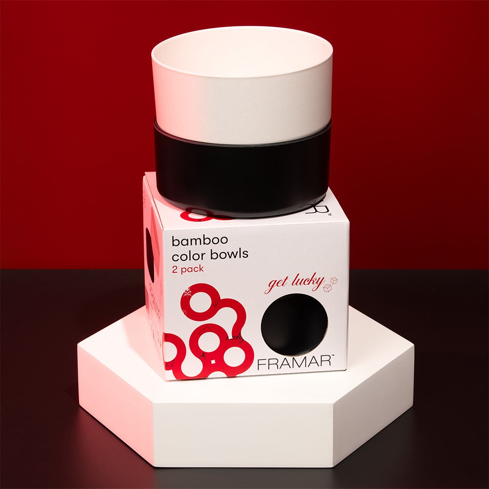 It's time to mix it up! Framar Bamboo Colour Bowl Set in Get Lucky is the dynamic duo your station has been waiting for. This pack of two colour bowls in black and white is made from sustainable bamboo fibre. BPA-free, bleach-proof and dishwasher-safe. Designed to hold all your best creations and help you through every colour service. Mix, carry and paint all in one bowl.