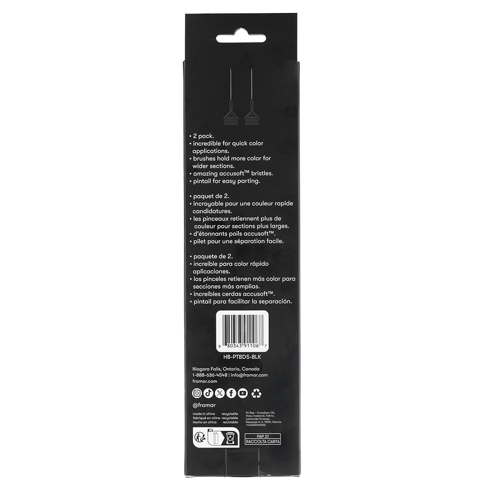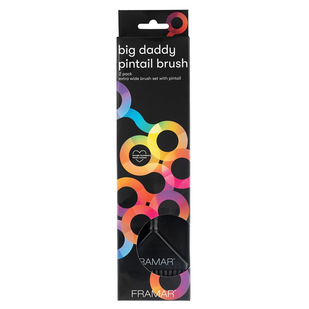 Your favourite colour brushes, reinvented. Framar Big Daddy Pintail Brush 2 Pack includes two brushes for all colour jobs. These extra-wide colour brushes are amazing for getting big jobs done fast. Now featuring a pintail for easy parting and sectioning. Framar’s famous AccuSoft bristles are tapered to pick up and distribute colour to hair evenly, quickly and precisely. The extra-wide brush head is designed for all over dye jobs and root tapping while still being comfortable in your hand.