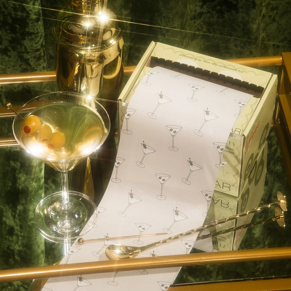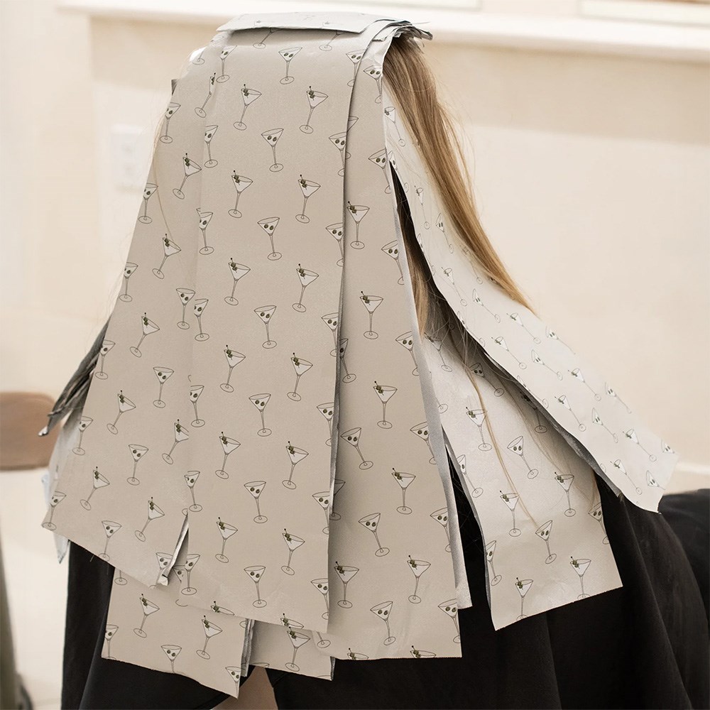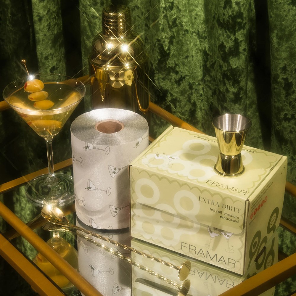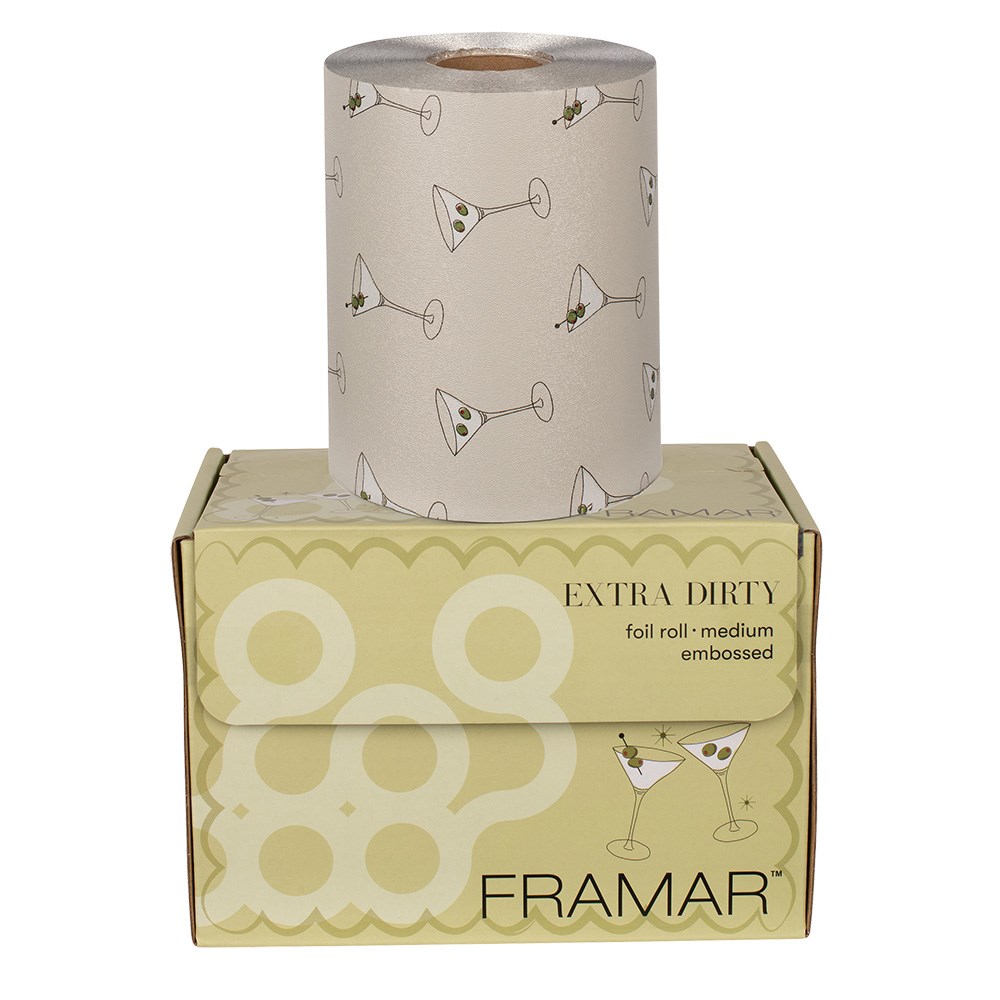 But first… a martini! Framar Embossed Foil Roll Extra Dirty is the perfect non-slip grip embossed foil. The embossed texture prevents slippage so you can breeze through any colouring service. High quality foil in martini print guaranteed to make every process more fun for you and your client. Rolls out easily with no-hassle cutting. Simply cut to your desired length with the inbuilt cutting blade in the dispenser box. Great for long hair and minimises waste.