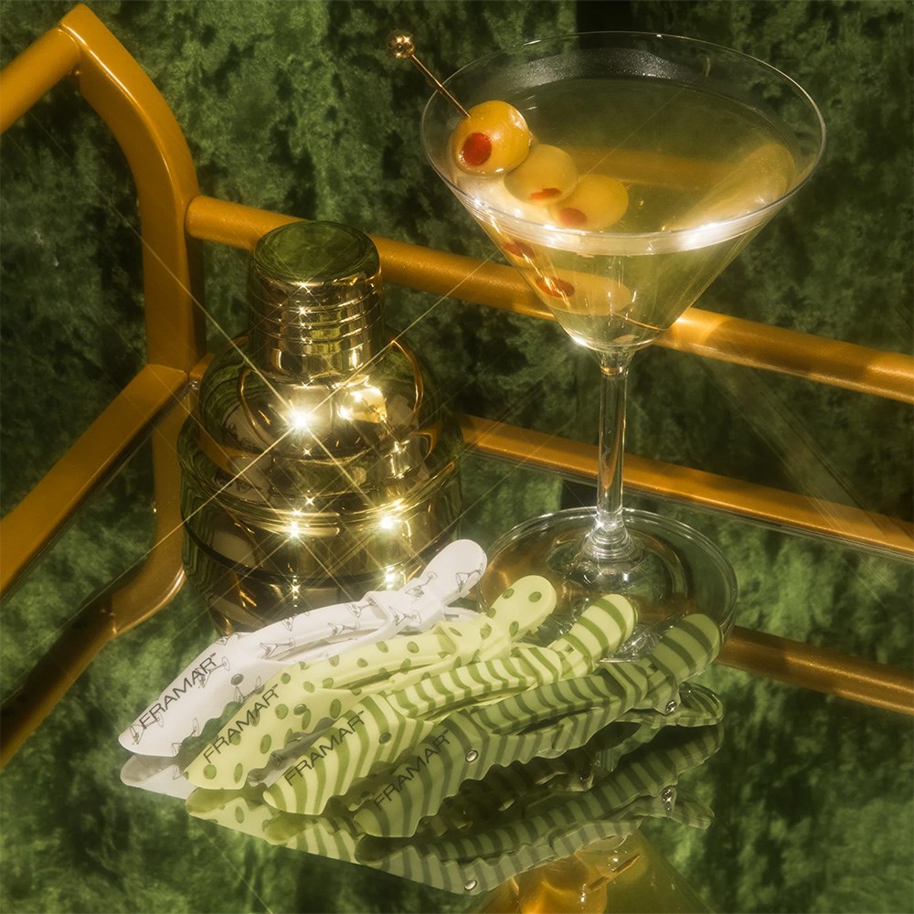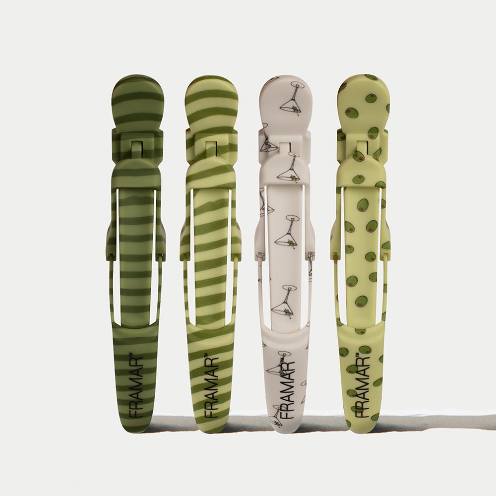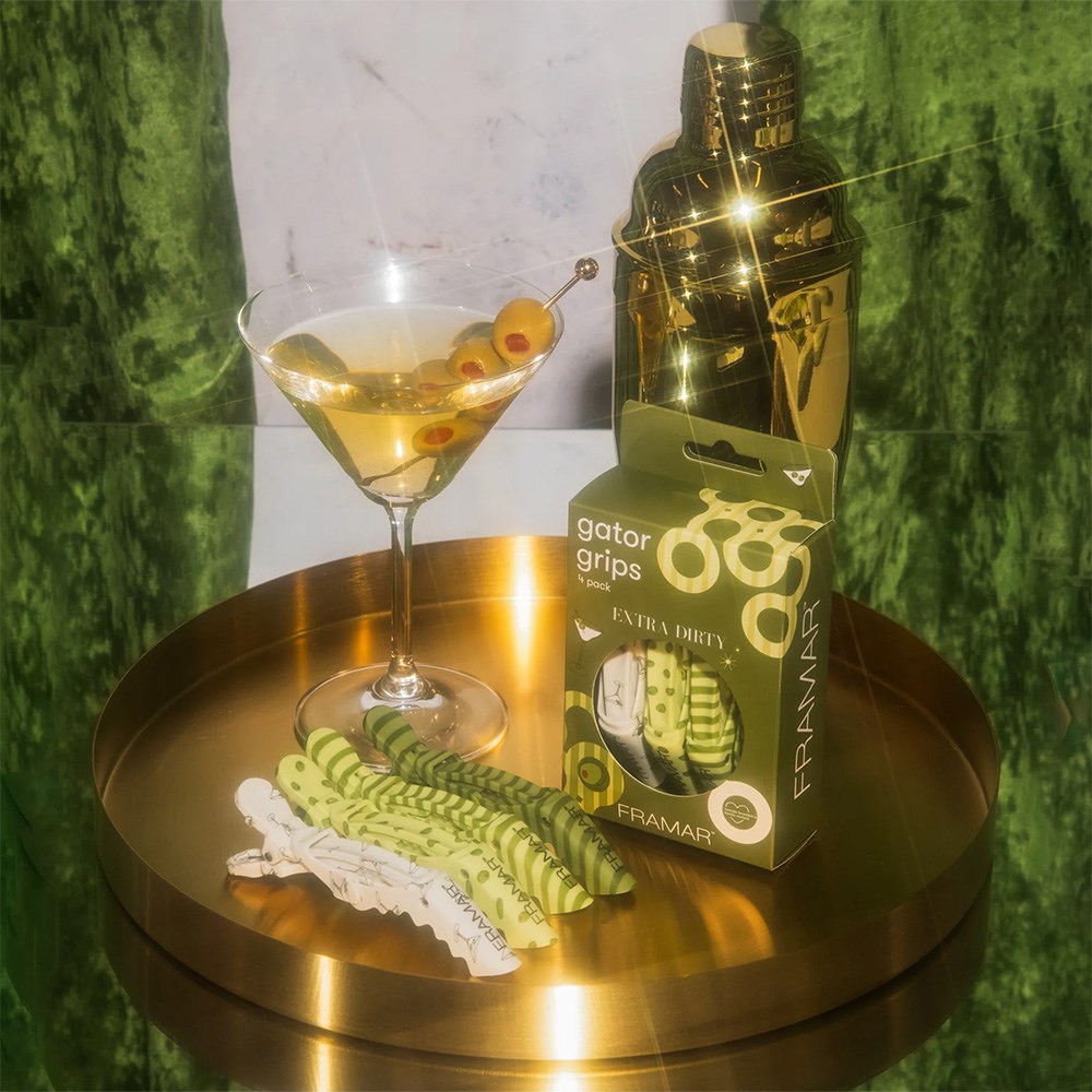 Your sectioning just got shaken, not stirred! Framar Gator Grip Clips 4 Pack Extra Dirty effortlessly holds large sections of hair. With a wide mouth and rubberised non-slip surface, these clips are stronger than an alligator. Secures hair during colouring, styling and foiling. Industrial springs for ultimate durability. The Extra Dirty collection is inspired by the joy of martinis. Pack of four.
