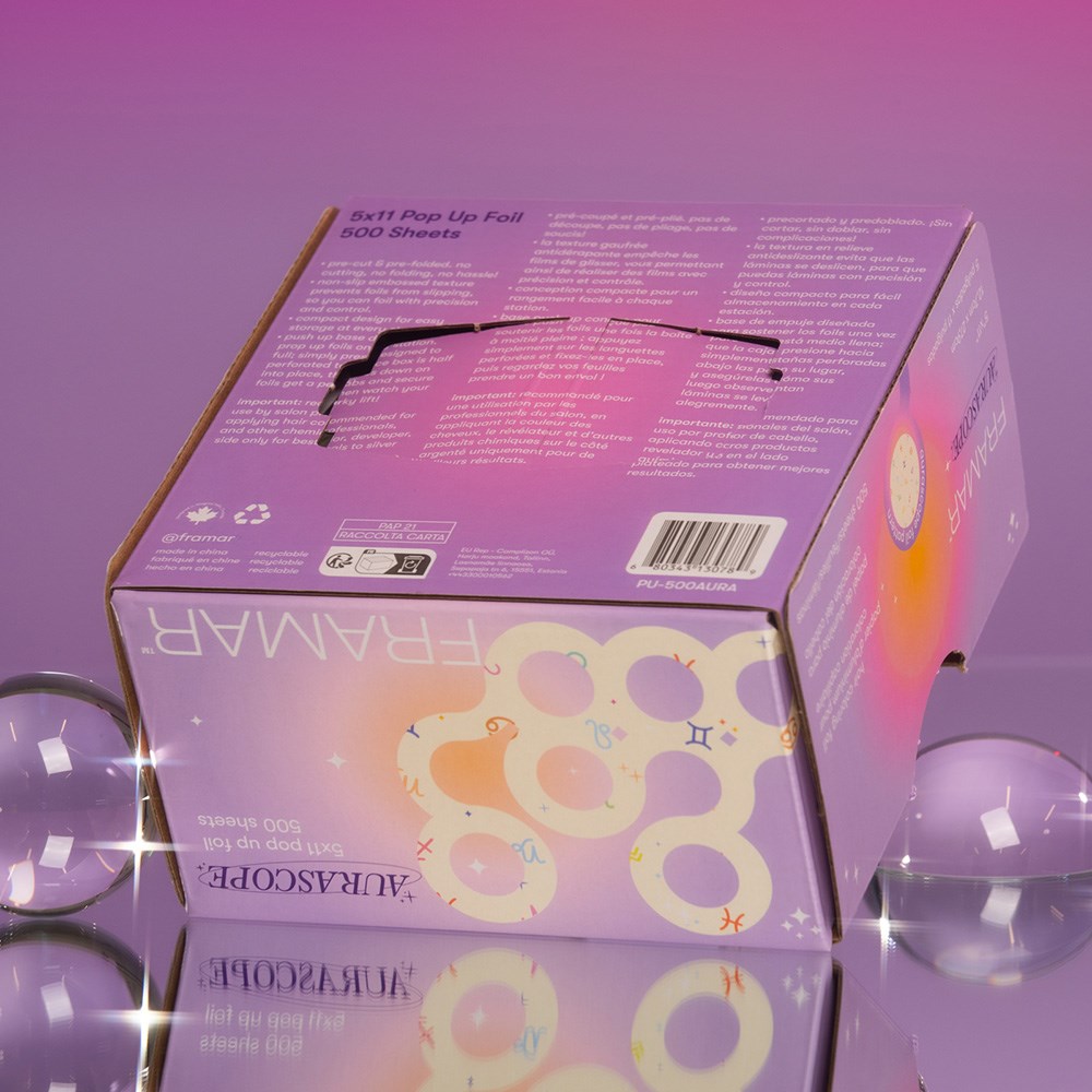 It’s written in the stars! Framar Pop Up Foil Aurascope is pre-cut, pre-folded and ready when you are. The embossed texture prevents slippage so you can breeze through any colouring service. High quality hairdressing foil with horoscope sign print is guaranteed to make every process more fun for you and your client. Featuring the signature, perforated push up base, designed to keep foils extra perky for ultimate convenience. Includes 500 sheets with each sheet measuring 12.7cm x 27.94cm. Good vibes!