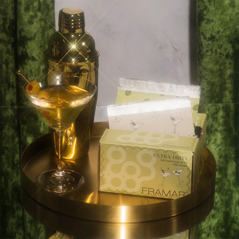 In your dirty martini era? Sip, sip, hooray! Framar Pop Up Foil Extra Dirty is pre-cut, pre-folded and ready when you are. The embossed texture prevents slippage so you can breeze through any colouring service. High quality hairdressing foil in alternating sheets of martini patterns. Featuring the signature, perforated push up base, designed to keep foils extra perky for ultimate convenience. Includes 500 sheets with each sheet measuring 12.7cm x 27.94cm.