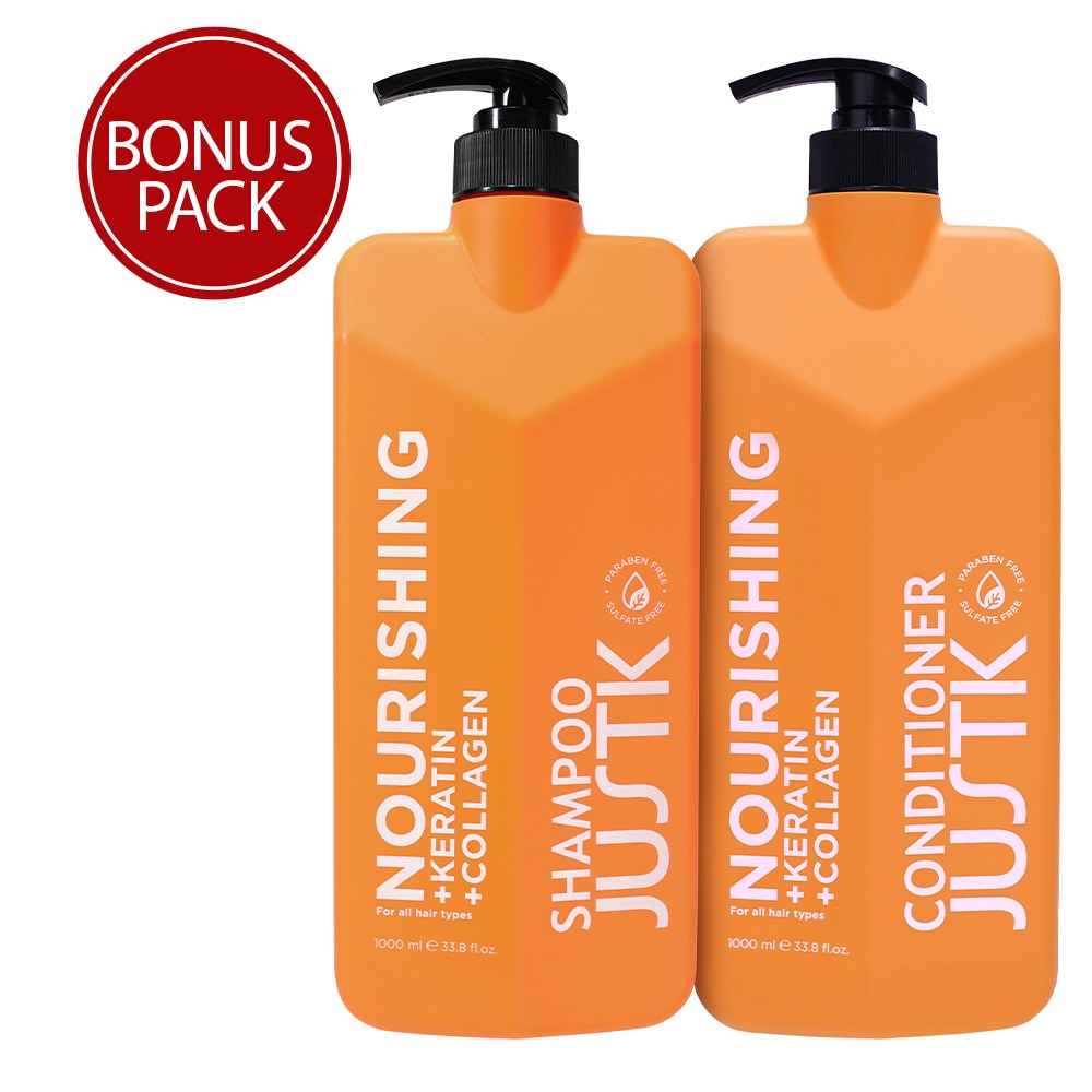 From woeful to wow, one wash at a time! Professional-grade formulas which solve all the problems of the hair rainbow. JustK Nourishing Duo 1L delivers essential hydration with a smooth, luminous finish. Infused with collagen for smoother, softer hair. This 1L shampoo and conditioner duo makes beautiful shine affordable!
