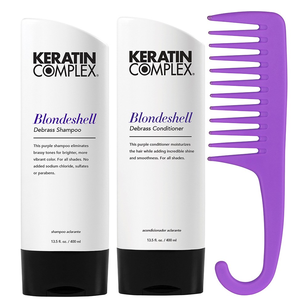 Beautiful blonde every day! Give the gift of true hues with this limited-edition Keratin Complex Blondeshell Sale Pack . A great introduction to the world of Keratin Complex at a great price. This special fade-fighting duo neutralises brassy tones, and keeps blonde and grey colours true. Softness and shine is boosted, while keratin renews strength. Great for both natural or chemically treated blondes. Bonus Premium Pin Company 999 Shampoo Comb gently detangles and distributes conditioner throughout hair.