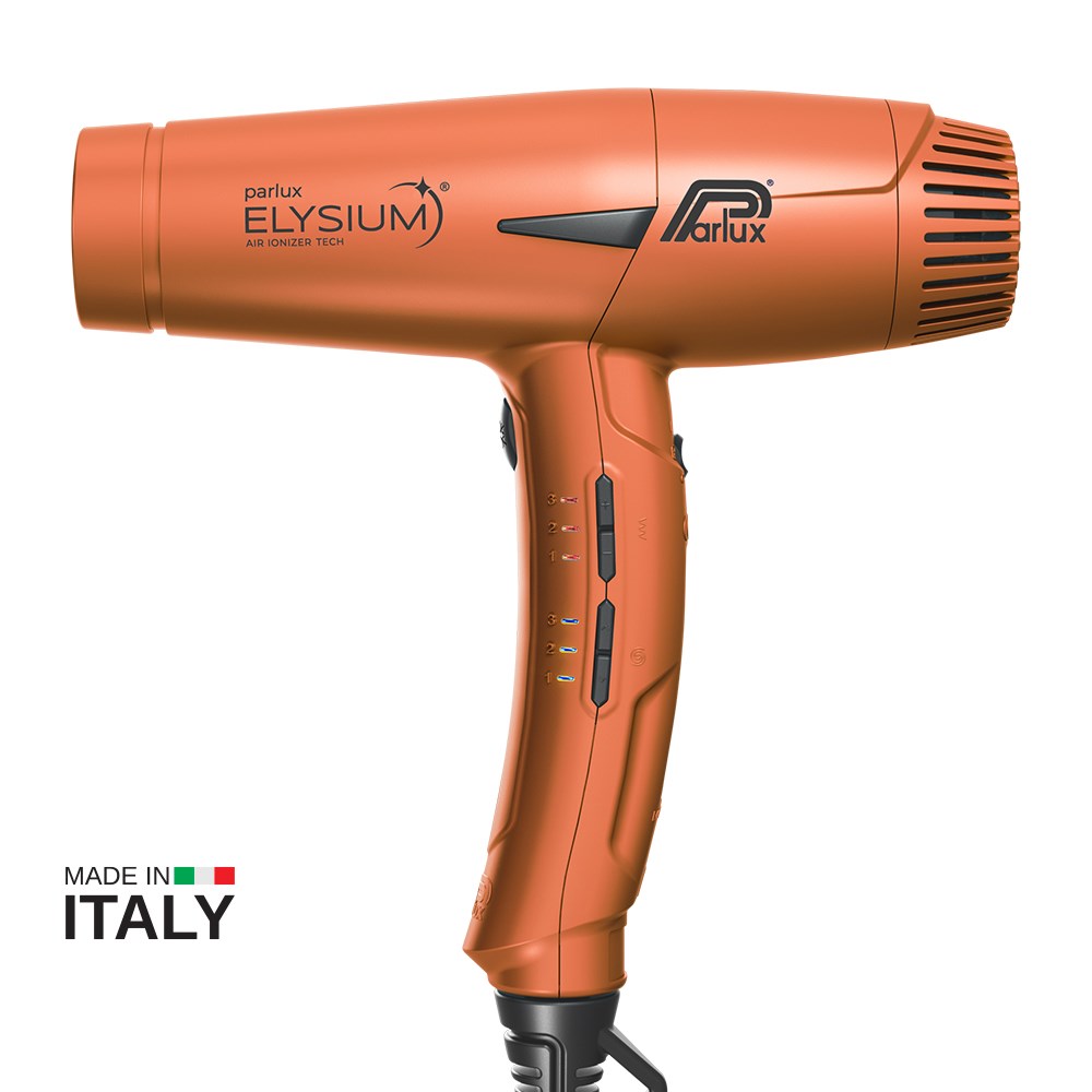 The first Parlux digital mini Hair Dryer. Designed to satisfy the demands of professionals, Parlux Elysium Hair Dryer Copper is a futuristic experience. With exceptional reliability, Parlux Elysium Hair Dryer is compact, light and powerful. Professional digital oversized mini-motor delivers a powerful 2,300 watts and 80m3/h airflow. 3 speed and 3 temperature settings for 9 versatile combinations. Air Ionizer Tech ionic technology for smooth, sleek results. Lightweight and ideally balanced with an ergonomic handle. Quick and easy cleaning with washable and replaceable sponge filter. Includes 3 concentrator nozzles, 2 of which are new AirFusion nozzles to optimise airflow for faster, more precise styling with added shine. Made in Italy.