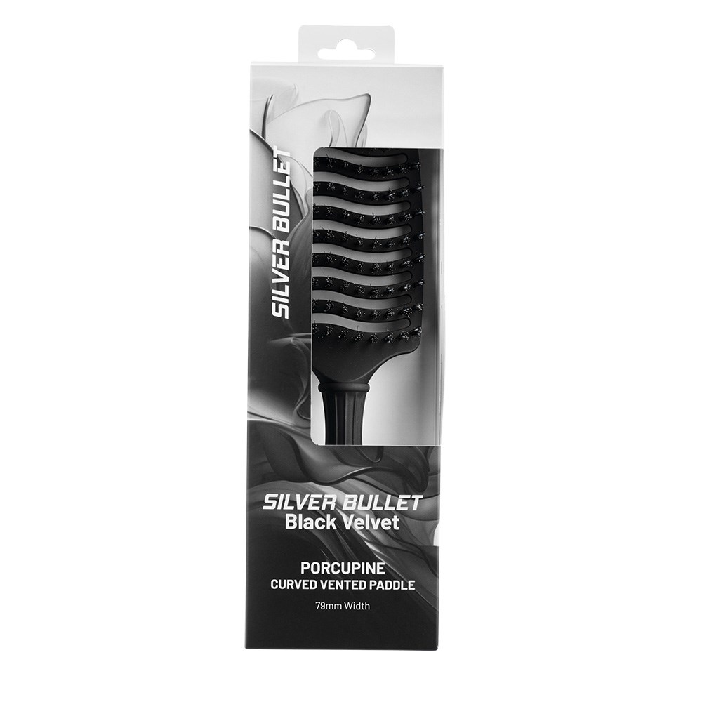 Hair as smooth and soft as velvet. Silver Bullet Black Velvet Curved Vent Porcupine Paddle Hair Brush is perfect for detangling, smoothing and drying. The vented design helps to speed up blow-drying to enhance your efficiency, while the curved head contours to the scalp for improved comfort. Featuring durable nylon and boar bristles, the Silver Bullet Black Velvet Curved Vent Porcupine Paddle Hair Brush makes detangling, smoothing, and styling hair effortless while delivering salon-quality results.