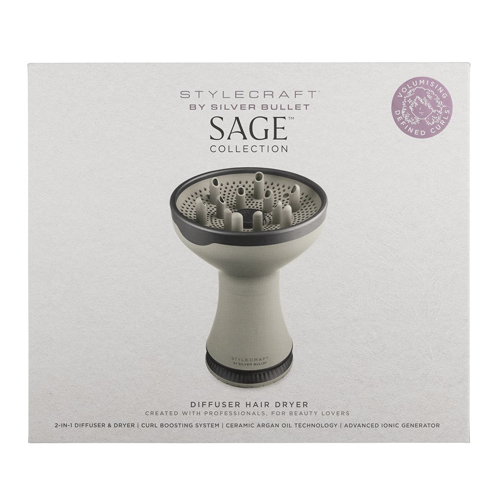 Ingenuity and innovation. StyleCraft by Silver Bullet Sage Diffuser Hair Dryer is a 2-in-1 diffuser and hair dryer designed to define curls, reduce frizz and amplify luminous volume. In sage green, StyleCraft by Silver Bullet Sage Diffuser Hair Dryer is a curl boosting system which helps curls dry faster and retain better shape with even distribution of air. Ceramic argan oil technology adds shine, enhancing moisture for gorgeously radiant locks. Advanced ion generator reduces frizz for silky smoothness. 2 heat and 2 airflow settings, plus a cool shot to set style in place. Ultra-lightweight, super-convenient, ergonomic design fits perfectly in your hand – more comfortable than juggling a traditional hair dryer with a bulky diffuser attachment!