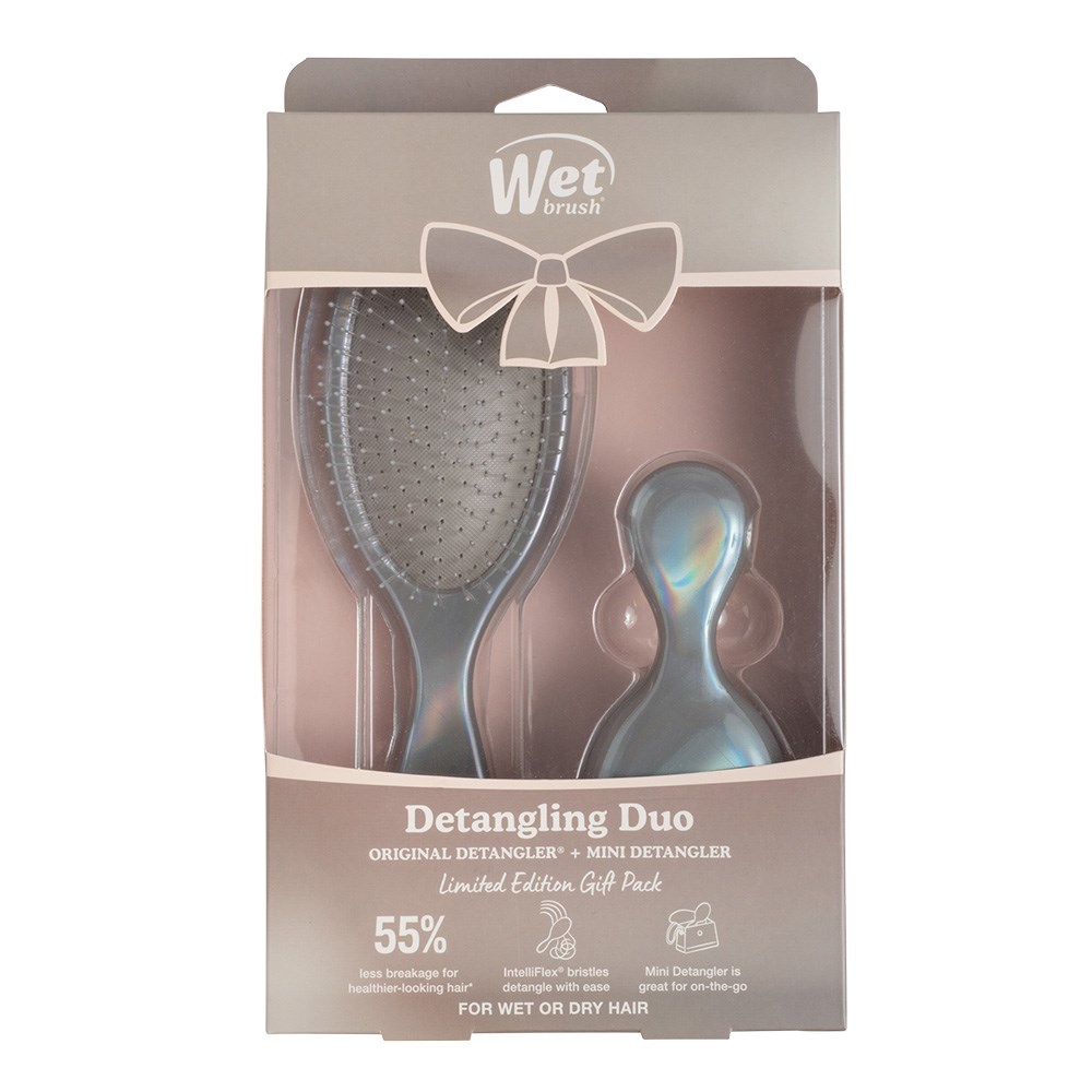 Detangling at home and on-the-go in a holographic dream. This limited edition WetBrush Holographic Detangler Kit Chrome includes the Original Detangler and a Mini Detangler. The world-famous, ultra-soft IntelliFlex bristles glide through tangles on all hair types with ease. The mini size is perfect for on-the-go. The moment you use it, you’ll feel the difference and never want to try another hairbrush again. Add some shine to your day with this limited edition Duo Kit.