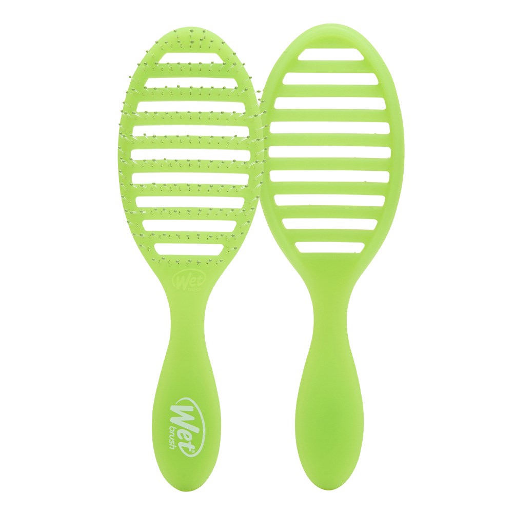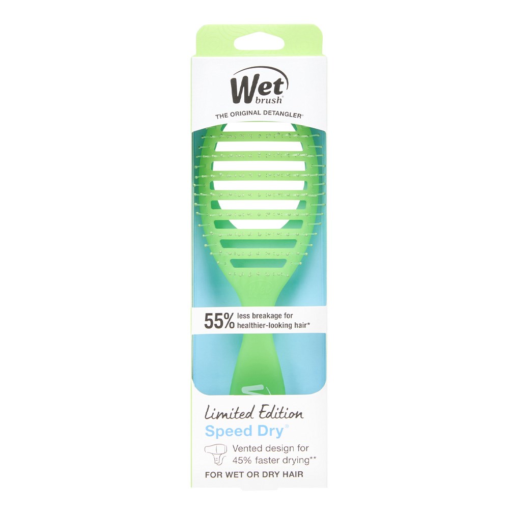 Meet the WetBrush Summer Quenchers Speed Dry Lime. Dry hair without drying it out. The Speed Dry’s vented design speeds up drying time by allowing moisture to escape faster. Heat-resistant Wet Brush HeatFlex bristles gently detangle while blow-drying. Skip the extra heat and avoid damage, helping to keep hair happier. Brush design contours to scalp for extra comfort. Limited edition.