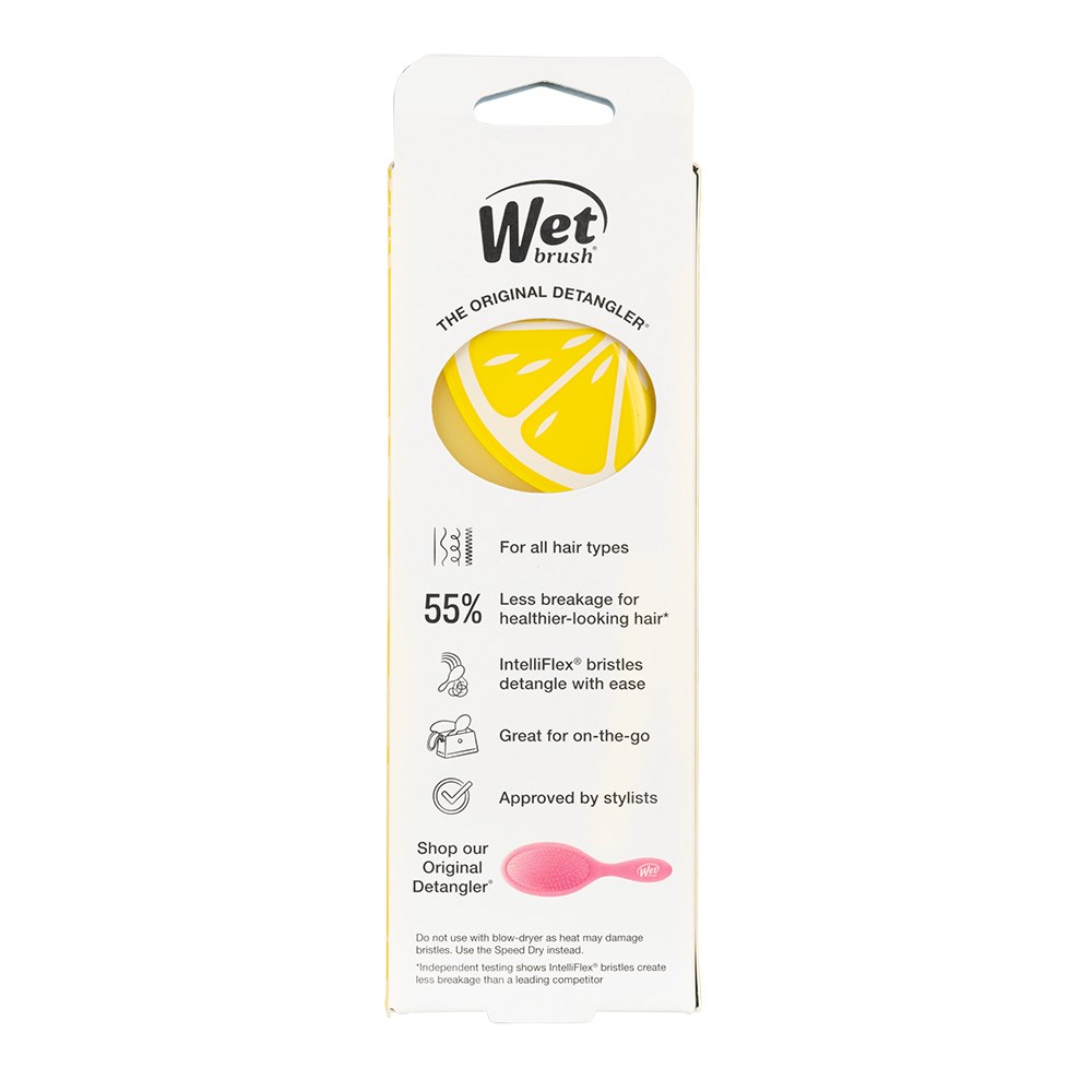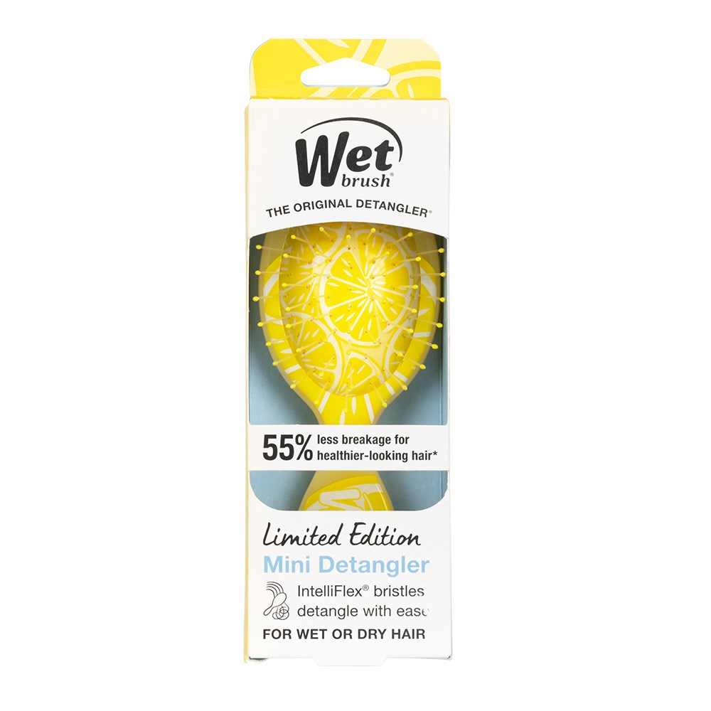 Sweetly detangle with this adorable on-the-go brush! WetBrush Tutti Fruitti Mini Detangler Lemon helps hair stay strong and healthy-looking. Gently loosen knots on wet or dry hair, without pulling or snagging. Exclusive, ultra-soft IntelliFlex bristles glide through tangles on all hair types with ease. The moment you use it, you’ll feel the Wet Brush difference and never want to try another hairbrush again. Kids love it too! Limited edition in Lemon.